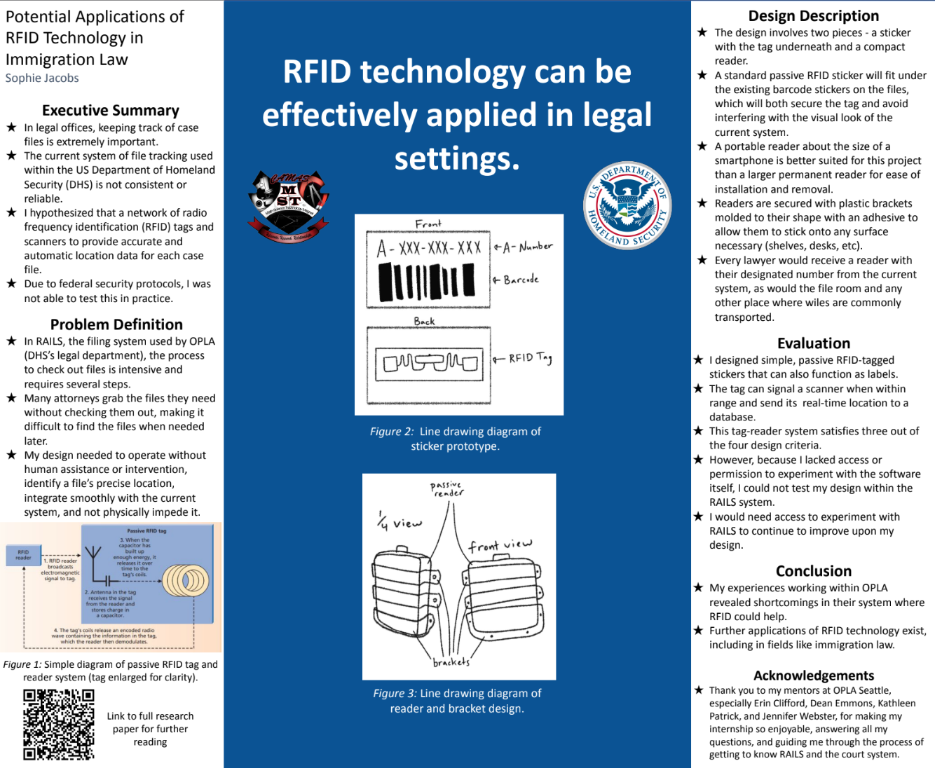 Ms. Jacobs interned with the Office of the Public Legal Assistant (OPLA). Although she began her internship without a predefined research focus, her early experiences and observations within the office allowed her to identify a practical need and independently shape the direction of her project. Her project focused on the potential use of RFID technology to improve file tracking within immigration law systems. Her research explored how passive RFID tags and portable scanners could streamline the location and management of legal case files, reducing inefficiencies and minimizing reliance on manual processes. By designing and evaluating a prototype RFID tagging system, Ms. Jacobs demonstrated how emerging technologies could be effectively adapted for legal settings to improve accuracy, accessibility, and operational efficiency. You can view her poster here: Potential Applications of RFID Technology in Immigration Law.