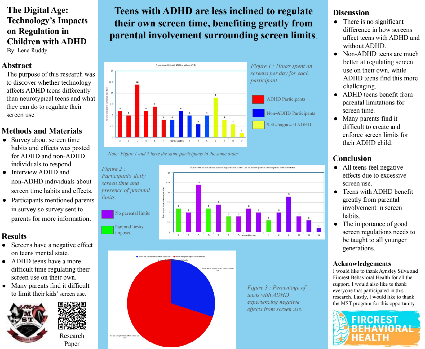 Ms. Ruddy completed her internship with Fircrest Behavioral Health, where she conducted research on the relationship between screen use and self-regulation in teens with ADHD. Her study examined whether technology affects adolescents with ADHD differently than their neurotypical peers, using surveys and interviews to assess screen time habits, mental health effects, and the role of parental involvement. Her findings indicate that while excessive screen use negatively impacts all teens, those with ADHD face greater difficulty regulating screen time independently and benefit significantly from parental limits and guidance. As someone with an ADHD family member, Ms. Ruddy found that this project allowed her to gain a deeper understanding of the varied perspectives and experiences of individuals with ADHD. You can view her poster here: Technology’s Impacts on Regulation in Children with ADHD.