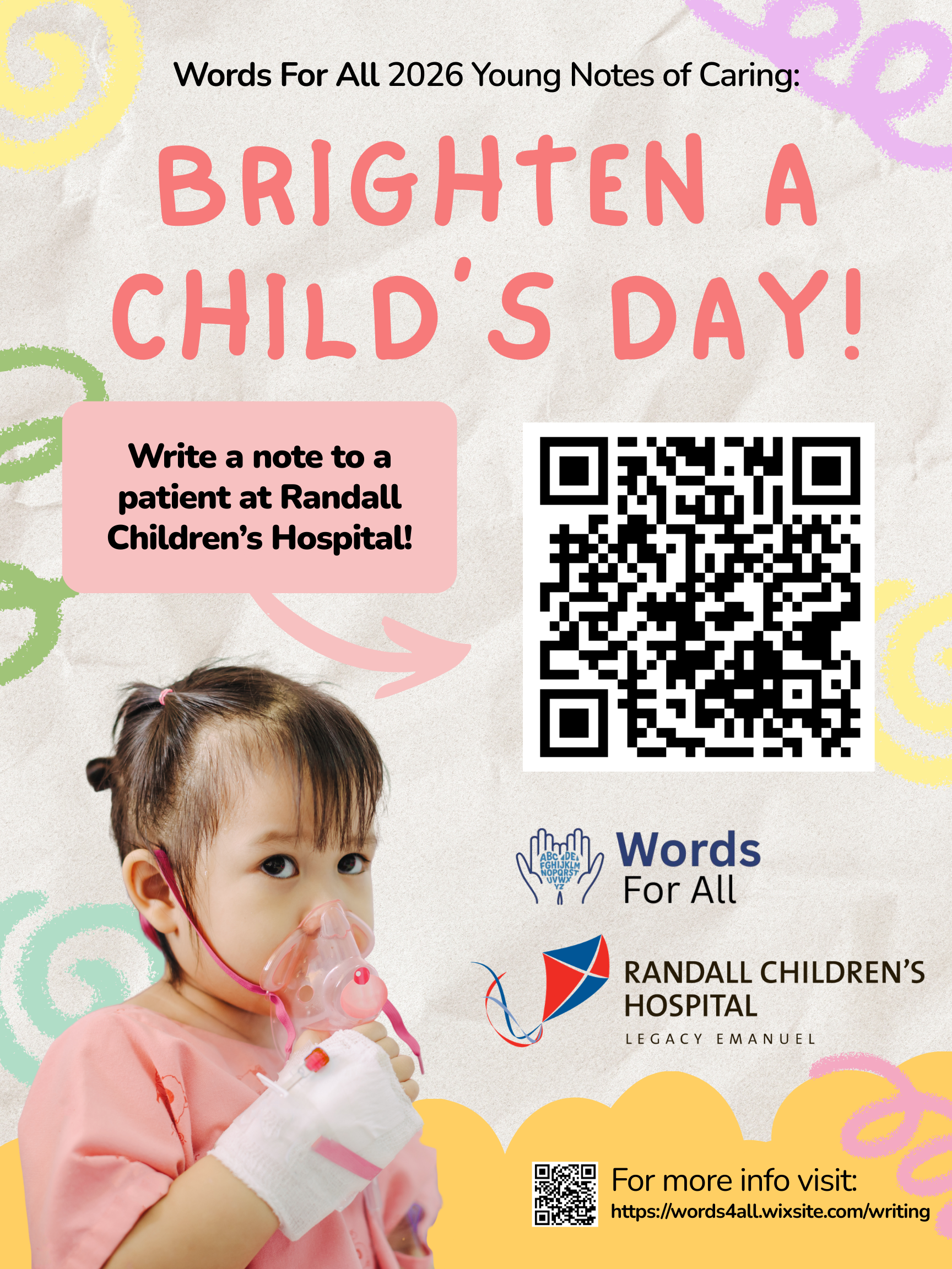 Through this event, Words For All invites the community to write kind, encouraging messages for the young patients at Randall Children’s Hospital at Legacy Emanuel. Hospital stays can be scary and overwhelming for kids, but even a short, thoughtful note can brighten their day. The event is collecting messages both in-person and online (see the attached link)!